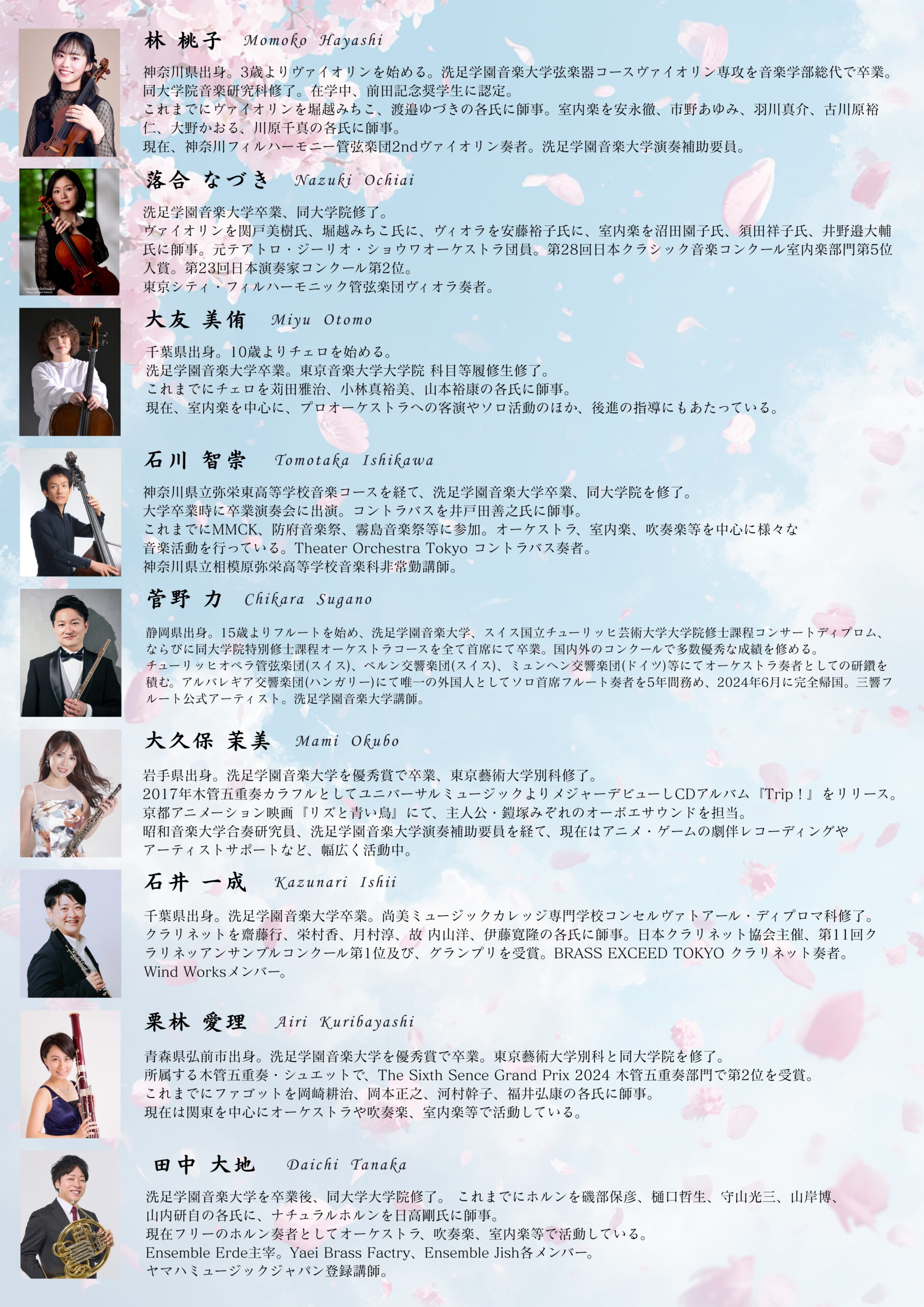 菅野 力(42期・Fl)、大久保 茉美(44期・Ob)、石井 一成(41期・Cl)、栗林 愛理(45期・Fg)、